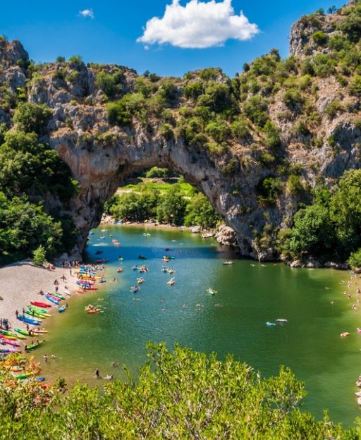 At the upstream entrance to the gorge stands the Pont d’Arc — a 54-metre natural stone arch that the river carved across millennia. Kayakers drift beneath it every day in summer, entering the gorge without realising the world’s oldest paintings lie a few kilometres downriver. The arch has become the symbol of the entire region, and it earns the status.
