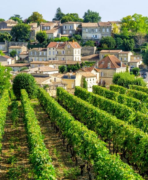 Vineyard rows sweeping across the slopes of Saint-Émilion, Bordeaux, France, with the medieval village on the hillside